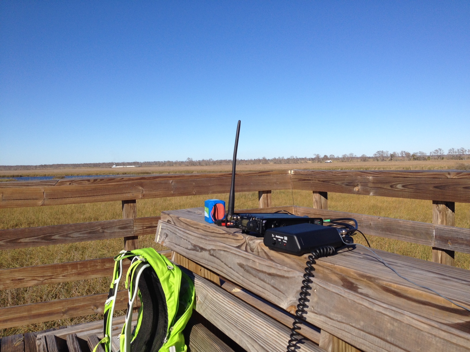 Nice afternoon with 60-ish temps and clear blue skies, so I took a little day hike with the FT-817nd and related gear to the old ANER boardwalk / marsh viewing platform. No bugs today! Not a lot of contacts either -- 2 on HF and 3 on UHF/FL-SARNET. Still, it got me out of the house and back on HF. While there, we saw several barges on the river (one in pic below), a couple of bald eagles, and one biplane. Pretty outstanding for a little Saturday afternoon stroll.
